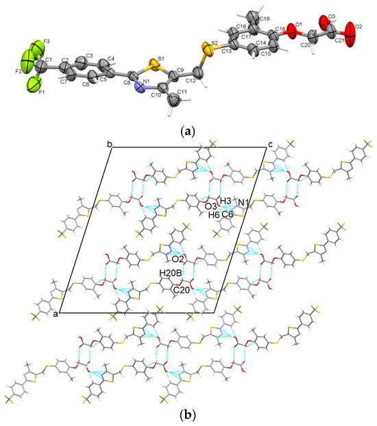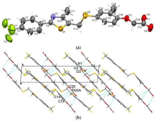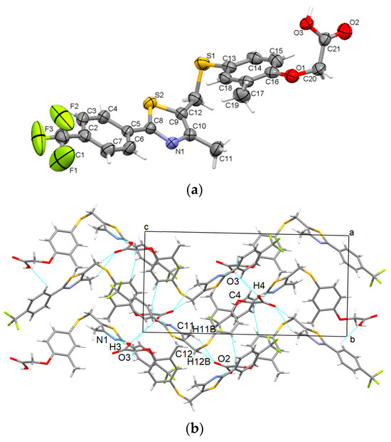The slow evaporation of GW501516 in a mixture of pentane and acetone yielded the formation of a new polymorph which crystallizes in the monoclinic crystal system (centrosymmetric P21/n space group) with one molecule in the asymmetric unit, which adopts a twisted shape at the methylsulfanyl and acetate group (Figure 3a). The formation of supramolecular assemblies is driven by a multitude of intermolecular interactions (i.e., C-H···O, C-H···F, C-H···π) among which are strong unidirectional O-H···N hydrogen bonds between the acetate group and the thiadiazol ring (Figure 3b).