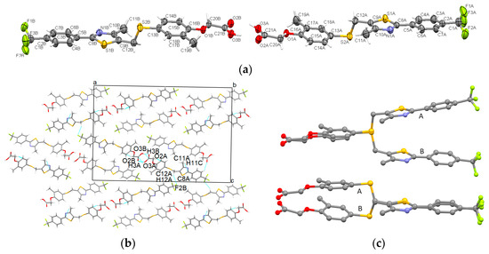 The fourth analyzed and reported polymorph of GW501516, found in the starting sample, crystallizes in a non-centrosymmetric space group (namely Pca21 of the orthorhombic crystal system). In this case, the asymmetric unit is found as a dimer comprising two individual molecules (denoted with A and B suffixes). Both molecules depict two plane-like conformations linked by the C12-S2 bond (Figure 5a). Mutual carboxyl···carboxyl O-H···O hydrogen bonds which form a R22(8) homosynthon are present in the dimer formation. Crystal cohesion is assured via strong O-H···O hydrogen bonds between the carboxyl groups, C-H···π interactions between phenyl rings and acetate groups, and C-H···O interaction with the carboxyl oxygen playing the role of donors. The supramolecular packing diagram seen along the b-axis is illustrated in Figure 5b. Molecule A and molecule B can be considered to be composed of two fragments bounded by the S2-C12 bond. Their superposition shows that the two molecules are generated approximately from each other by mirroring and the fluorine atoms are rotated relative to each other (Figure 5c).