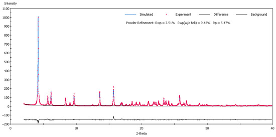 The obtained structural model was refined via the Rietveld method with the Reflex module of the Materials Studio software [25]. Many parameters on which the diffraction pattern depends have been refined. The diffraction profile was approximated with a Pseudo-Voigt function whose parameters were refined, and the diffraction background was approximated with a polynomial of degree 20. The following parameters were also refined: (U, V, W) from the Caglioti equation [27], the shift parameters (zero point, shift#1 and shift#2), the asymmetry parameters from the Berar–Baldinozzi equation, the preferential orientation parameters (a*, b*, c* and R0) from the March–Dollase approximation, and profile parameters in Bragg–Brentano geometry (NA, NB). In the end, an improved solution was obtained which has a good match between the calculated powder diffraction pattern and the experimental one and which is presented in Figure 6. The final crystallographic parameters are presented in Table 3.
