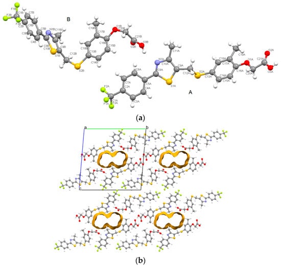 Asymmetric unit of GW-1 displaying the atoms as ball and stick along with the individual A and B molecular fragments (a); crystal packing and voids seen along the a-axis (b).