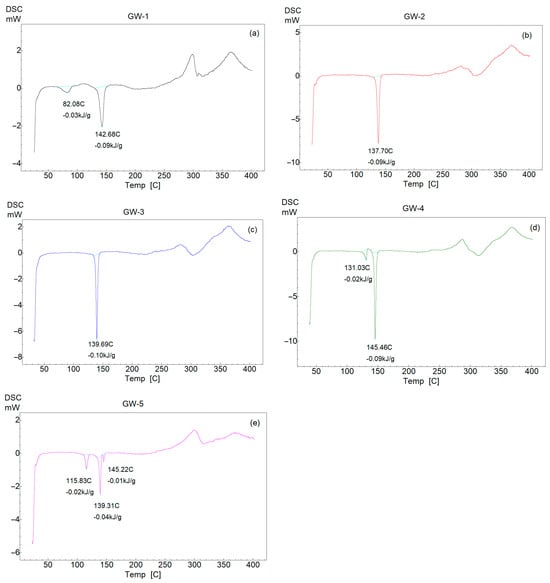 DSC curves of analyzed polymorphs: GW−1 (a); GW−2 (b); GW−3 (c); GW−4 (d) and GW−5 (e).