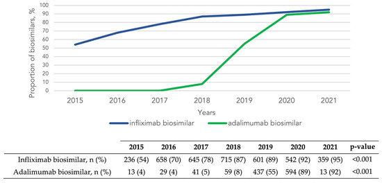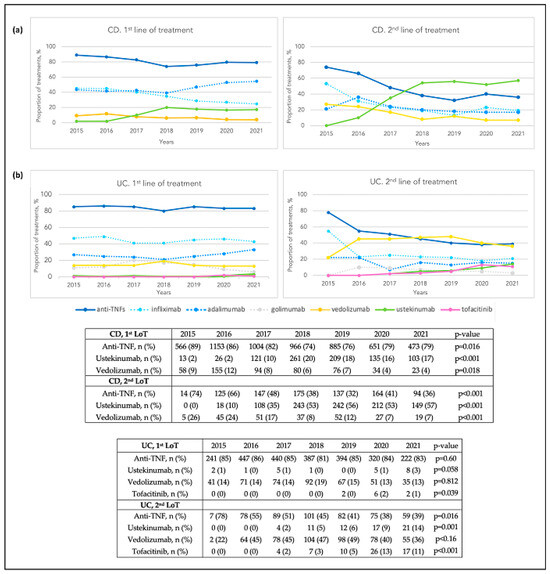 - Zhao, M.; Sall Jensen, M.; Knudsen, T.; Kelsen, J.; Coskun, M.; Kjellberg, J.; Burisch, J. Trends in the Use of Biologicals and Their Treatment Outcomes among Patients with Inflammatory Bowel Diseases—A Danish Nationwide Cohort Study. Aliment. Pharmacol. Ther. 2022, 55, 541–557. [Google Scholar] [CrossRef]