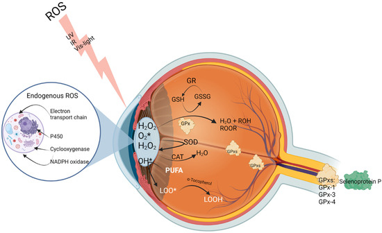 Within the cellular membrane, GPx4 reduces fatty acid hydroperoxides and phospholipid hydroperoxides working in combination with α-tocopherol to prevent LPO (Figure 4) [52]. The primary intracellular isoform is GPx1, the absence of which has been associated with membrane damage in the lenticular nucleus [49]. Gene-knockout mice with GPx1 deficiency exhibited increased nuclear light scattering in the lens, membrane damage, and cataract development, demonstrating the significant role of GPX-1 in the antioxidant defence systems of the lens nucleus [53]. The significance of GPx activity in cataract development (particularly nuclear cataract) is well established [54,55,56]. Antioxidant levels become significantly depleted with age, resulting in oxidative stress and damage to different ocular segments [13]. Therefore, supplementary antioxidants are used in an effort to counteract the loss of some ocular antioxidants and slow down the progression of ocular conditions. Dietary Se is fundamental to ensure sufficient GPx expression.