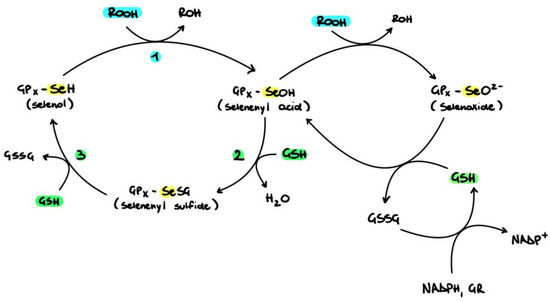 Redox cycle of glutathione peroxidase (GPx). (1) The SeH in the GPx can be oxidised by H2O2 or other oxidants to selenic acid (GPx-Se-OH). This can then be transformed back to (GPx-SeH) via two steps. First, (2) glutathione reduces GPx-Se-OH to GPx-SeSG, and then (3) this is reduced back to GPx-SeH. GPx-Se-OH can also be overoxidised to seleninic acid (GPx-SeO2H) due to levels of oxidative stress or low glutathione concentrations. Adapted from [51].