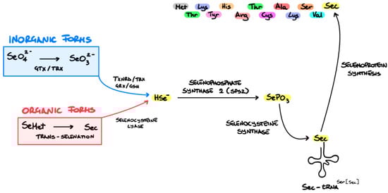 Selenoprotein biosynthesis. Nutritional Se, regardless of its form, must be transformed to the active metabolite selenide (Se2−), which serves as the selenium pool for the integration of selenium into selenoproteins. Inorganic Se forms are converted to the active metabolite via the GSH–GR and thioredoxin pathways, while organic forms are metabolised by selenocysteine lyase. Then, tselenophosphate (SePO33−) becomes incorporated into proteins via a distinctive pathway where a seryl (Ser) residue is exchanged with selenocysteine (Sec) before integration into proteins. Adapted from [67].
