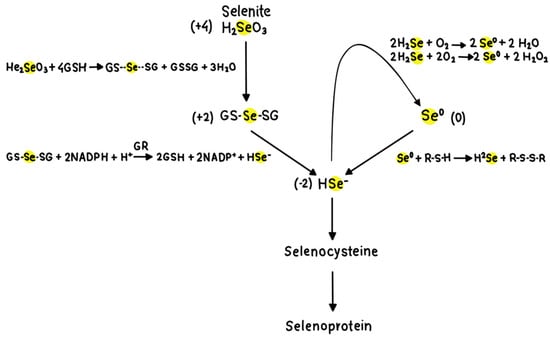 The efficiency with which SeNPs can be metabolised from the diet and then integrated in reduced form into selenoproteins is unknown. However, the studies mentioned above show an increase in GPx enzyme activity in response to dietary SeNPs, confirming elemental Se metabolism and its utilisation to synthesize selenoproteins. Recently, a study compared the bioavailability of SeNPs with other Se forms (sodium selenite and SeMet) in mice [87]. Elemental SeNPs increased the GPx enzyme activity levels in Se-fed mice similarly to those caused by organic Se (SeMet) and to a greater extent than sodium selenite. This could be due to the fact that the conversion of elemental Se (0) to hydrogen selenide (−2) only requires one reduction step, but the reduction of selenite (+4) to hydrogen selenide requires numerous processes (Figure 6). This study also pointed out that since both elemental Se and inorganic Se were incorporated into selenoproteins, there is likely to be a common metabolic pathway. Elemental Se can readily react with sulfur compounds, yielding selenium in the fully reduced form, hydrogen selenide, which is the active metabolite for selenoprotein synthesis (Se0 + 2 R-S-H →H2Se + R-S-S-R) [87].