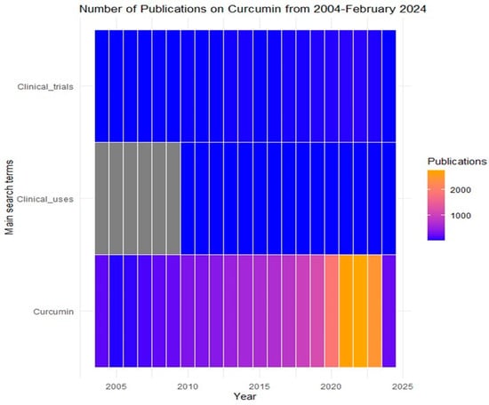 Number of publications related to Curcumin per year. The data were obtained from PubMed using the following keywords: Curcumin, curcuminoids, nanoparticle, clinical uses, clinical trials. The blue color indicates a low number of published articles, and the yellow color indicates a high number of published articles captured in the PubMed database/website (https://pubmed.ncbi.nlm.nih.gov/). Accessed on 28 February 2024.