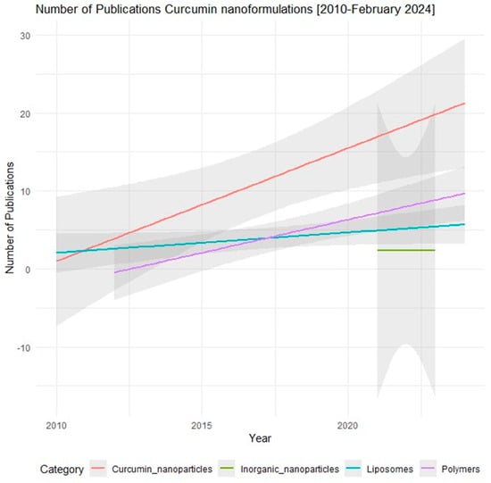 Number of publications related to Curcumin nanoformulation from 2010 to February 2024. The data were obtained from PubMed (https://pubmed.ncbi.nlm.nih.gov/) using the following keywords: Curcumin plus nanoparticle, Inorganic nanoparticles, polymers/polymersomes, lipid−based nanoparticle/liposomes. Accessed on 28 February 2024.