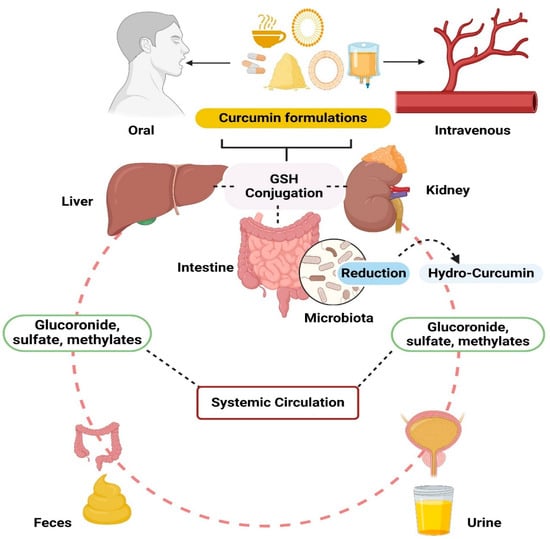 Oral or intravenous administration of different formulations of curcumin result mainly in conjugated or reduced curcumin detected in systemic circulation (plasma), and intravenous administration results mainly in only reduced curcumin metabolites (hydrocurcumins).