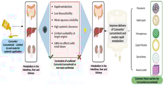Schematic representation of the limitations of curcumin bioavailability and nanocarrier-mediated improvements in delivery. Raw curcumin/curcuminoids face numerous challenges hindering their therapeutic efficacy, including rapid metabolism, low bioavailability, weak aqueous solubility, high clearance, limited availability to target organs, and minimal effects at small doses. Nanocarriers, such as polymeric, solid lipid, mesoporous, liposomes, dendrimer nanoparticles, and nanocrystals, encapsulated curcumin/curcuminoids, shield it from rapid metabolism and enhance its stability in circulation. The utilization of nanocarriers represents a promising strategy to enhance the delivery of curcumin, circumventing its inherent limitations and maximizing its therapeutic potential in various disease treatments.