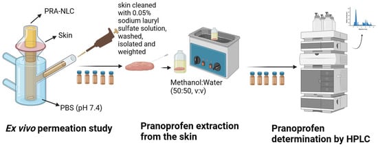 Table 3 shows the experimental conditions for the ex vivo skin permeation assay. The skin diffusion area available was 0.64 cm2, and the receptor compartment was filled with phosphate-buffered saline (PBS) at pH 7.4. A volume of 50 µL of PRA-NLC was added to the donor compartment in direct contact with the skin. As in the in vitro release test, a PRA solution was tested in parallel as the control. Parafilm® was utilized to prevent evaporation by sealing the sampling ports and the donor compartment. Aliquots of 200 µL were withdrawn from the receptor compartment at fixed times and replaced by an equivalent volume of the receptor medium. The quantity of PRA permeated was determined via HPLC method. At the end of the permeation experiment, diffusion Franz cells were dismantled, and the skin tissues were taken out, cleaned with 0.05% sodium lauryl sulfate solution, rinsed two times with distilled water, and carefully blotted dry with filter paper [36,37]. The permeation area of the skin tissue was cut out, weighted, and perforated by a thin needle. The PRA amount retained in the skin (Qret (µg/g skin/cm2)) was extracted in 1 mL of methanol–water (50:50) via an ultrasound water bath technique for 15 min. Solvent samples were analyzed via HPLC, yielding the amount of pranoprofen retained in the skin. Figure 2 represents a diagram of the steps of the permeation experiment.