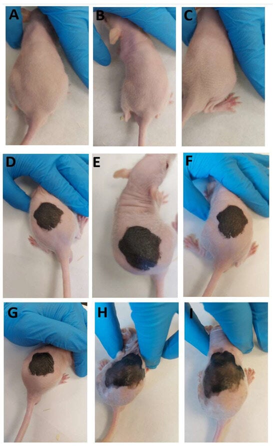 Experimental back tattoo groups in a hairless mouse model: (A–C) negative control at 5, 25, and 45 min, respectively; (D–F) positive group at 5, 25, and 45 min, respectively; (G–I) group treated with PRA-NLC at 5, 25, and 45 min, respectively.
