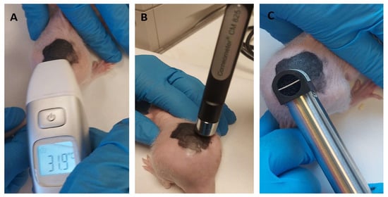 Devices for the measure of biochemical parameters in the backs of hairless rats: (A) thermometer to measure T (°C); (B) Corneometer® probe to measure SCH (arbitrary units); (C) TEWL-Dermalab® probe to measure TEWL (g/h·m2).