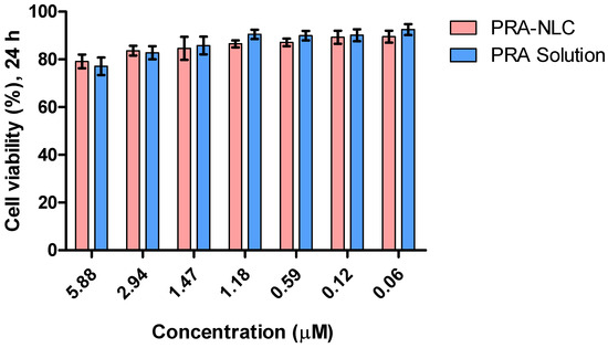 In vitro cytotoxicity of PRA-NLC suspension and the plain solution of PRA in HaCaT cells exposed for 24 h at different concentrations.