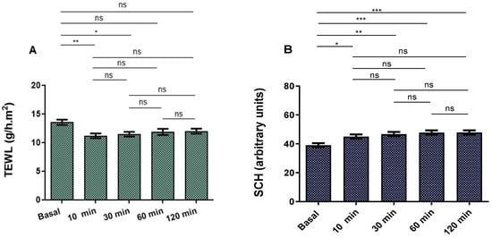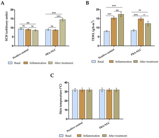Skin biomechanical parameters on healthy-skin volunteers: (A) TEWL (g/h·m2) of PRA-NLC; (B) stratum corneum hydration of PRA-NLC expressed as arbitrary units (n = 10). p-values: * p < 0.05, ** p < 0.01, *** p < 0.001. ns = non-significant.