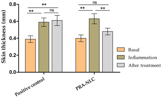 The efficacy of PRA-NLC was analyzed using two in vivo models: a xylol-induced acute inflammation model in mouse ears and a post-tattoo inflammation model on the back in hairless rats. The inflammatory pathway is a complex pathophysiological response that helps the body defend itself against pathogens that cause damage at the cellular level. The inflammatory process at the skin level manifests itself with various signs and symptoms, including increased skin thickness, erythema, dry skin, infiltration of inflammatory cells, and the release of various inflammatory mediators. Increased skin thickness is indicative of edema, increased vascular permeability, and keratinocyte proliferation [72,73]. In this study, the topical application of xylol caused an increase in skin thickness due to the inflammatory reaction. On the contrary, topical treatment with PRA-NLC decreased this parameter after 20 min of treatment, showing no significant differences with the initial state (Figure 9). Finally, the post-tattoo inflammation model in the hairless rat back revealed that the integrity of the skin was compromised by significantly increasing the TEWL after the tattoo was performed. This result could be due to a destabilization of the skin surface and the follicular ducts, causing a modification in the stratum corneum [74,75]. However, topical treatment with PRA-NLC significantly restored this parameter while increasing SCH, demonstrating its hydration potential after 20 min of treatment. Histological evaluation showed damage to the stratum corneum, slight edema, and leukocyte infiltration in the tattooed skin of the positive control. All of these symptoms were reversed after treatment with PRA-NLC, supporting the efficacy of the formulation in the treatment of post-tattoo inflammation.