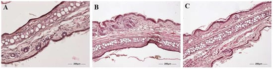 Representative images of histological sections obtained from xylol-induced inflammation model: (A) control conditions; (B) positive control; (C) PRA-NLC group. The asterisk indicates leucocyte infiltrate. e = epidermis; d = dermis; ac = auricular cartilage 100× magnification. Scale bar = 200 µm.
