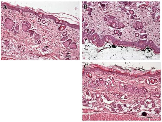 Histological analysis was carried out for the two in vivo experiments. The samples of the left ears from Mus Musculus mice and back skin from hairless rats were suspended in PBS for 3 h (replacing it with fresh medium in time intervals of 1 h). Then, they were preserved in a 4% buffered formaldehyde solution for 24 h, dehydrated in gradient ethanol, and then embedded in melted paraffin. The resulting blocks were cut into 5 mm sections, stained with hematoxylin and eosin, and observed using a microscope (Olympus BX41, Hamburg, Germany) equipped with an Olympus XC50 camera. Images were obtained at 100× magnification.