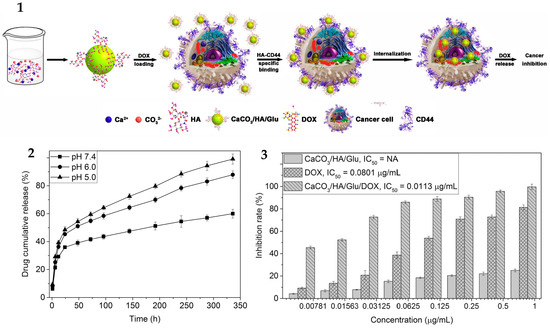 (1) Preparation of CaCO3/HA/Glu MHSs, efficient loading of DOX, targeted delivery, specific internalization, and significant inhibition of cancer cells. (2) In vitro release profiles of CaCO3/HA/Glu/DOX under different pH. Data represent the mean ± S.D.; n = 3. (3) Cytotoxic effects of free DOX, CaCO3/HA/Glu, and CaCO3/HA/Glu/DOX on HeLa cells after 3 d treatment. Data represent the mean ± S.D.; n = 3. Abbreviations: HA, hyaluronate; Glu, glutamate; MHSs, mesoporous hollow spheres; DOX, doxorubicin. Adapted with permission from Guo, Y. et al., J. Coll. Interf. Sci.; published by Elsevier, 2017 [52].