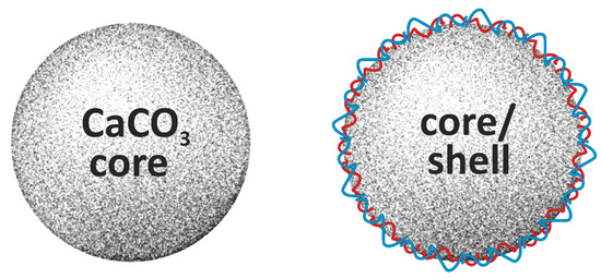 The CaCO3 particles coated with a polyelectrolyte shell are better suited for the delivery of drugs and proteins. Polyelectrolytes are deposited onto the cores by the LbL method [63,84] or by electrospray [85]. Variation of the number of cationic/anionic bilayers deposited on the particle surface allows better control of the kinetics of substance delivery to the target. Application of these polymers is driven by electrostatic interaction, through covalent or hydrogen bonds, which explains how the release of loaded molecules can be induced by different stimuli, such as pH, ionic strength, temperature change, or ultrasound.