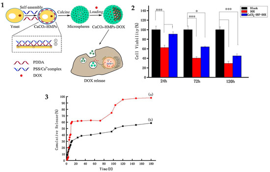 (1) Assembly schematic: the preparation of CaCO3-HMPs through self-assembly of two oppositely charged polyelectrolytes, PDDA and PSS, on the surface of yeast cells, as dual templates for drug loading and release. (2) Cytotoxicity tests of CaCO3-HMPs, DOX, and the CaCO3-HMPs-DOX drug-delivery system (* p < 0.05, *** p < 0.001); (3) Cumulative release curve of DOX in different environments: (a) pH = 4.8 and (b) pH = 7. Abbreviations: HMPs, herbal medicinal products; PDDA, poly(diallyldimethylammonium chloride); PSS, poly(sodium 4-styrenesulfonate); DOX, doxorubicin. Reproduced with permission from Wei, Y., et al. Coll. Surf. B Biointerf.; published by Elsevier, 2021 [58].