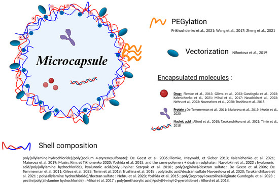 - Kalenichenko, D.; Nifontova, G.; Karaulov, A.; Sukhanova, A.; Nabiev, I. Designing functionalized polyelectrolyte microcapsules for cancer treatment. Nanomaterials 2021, 11, 3055. [Google Scholar] [CrossRef] [PubMed]