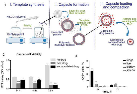 (1) Scheme of the stepwise capsule assembly, compaction, and loading. (2) Lung cancer cell viability in the presence of 20 μM free or encapsulated gemcitabine; MTT assay at the indicated time points. (3) Number of cells in the lungs, liver, kidney, and spleen with internalized Cy5-labeled capsules relative to the total amount of cells in the respective organs 24 and 72 h after intravenous injection of PMC. Abbreviation: PMC, polymeric multilayer capsules. Adapted with permission from Novoselova, M. V., et al. ACS Appl. Mater. Interfaces; published by American Chemical Society, 2020 [70].