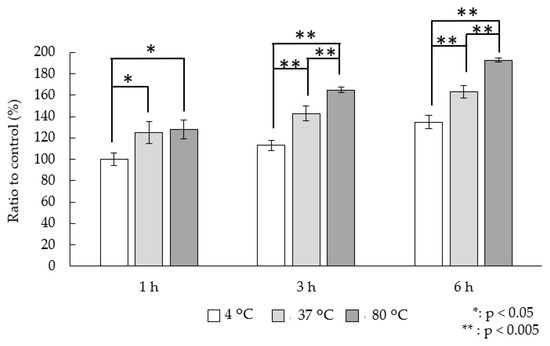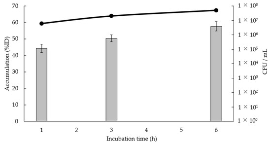 We examined the influence of incubation temperature on 123I-BMIPP accumulation. Bacteria heated at 80 °C for 30 min did not grow in the culture; thus, the bacteria appeared to be dead. The accumulation rates shown consider that accumulation is 100% at an incubation temperature of 4 °C and an incubation time of 1 h (Figure 2). At 4 °C, 37 °C, and 80 °C, the accumulations were 100%, 125%, and 128% at 1 h; 113%, 143%, and 165% at 3 h; and 135%, 163%, and 193% at 6 h, respectively.