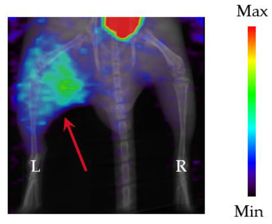 Representative SPECT image (maximum intensity projection (MIP)) of 123I-BMIPP in a P. aeruginosa SR24 mouse thigh infection model. Mice were infected in the left thigh (red arrow), and images were acquired 4 h after 123I-BMIPP administration.