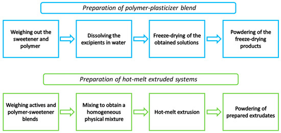 The hot-melt extrusion process was carried out in a HAAKE MiniCTW micro-conical twin screw extruder (Thermo Scientific, Karlsruhe, Germany). Components of systems were mixed using a mill (Tube Mill Control Mixer, IKA, Warsaw, Poland). Mixtures with 15 and 30% total content of active compounds were obtained. Then, the physical mixtures were fed manually into the hopper of the extruder at a barrel temperature of 150 °C and a screw speed of 90 rpm. The prepared extrudates were powdered by milling (Tube Mill control Mixer, IKA, Warsaw, Poland) and used for further studies. Figure 1 illustrates the preparation of the amorphous solid dispersions.
