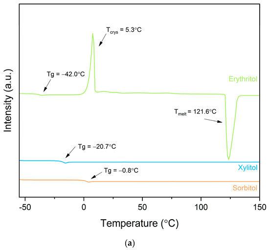 First, we decided to determine the glass-forming ability of sweeteners, which provided us with information about the ease of obtaining the amorphous state. The ease of forming the amorphous state makes it less likely that compound crystallization occurs quickly, which could also promote the crystallization of the active compounds. In assessing the glass-forming ability, we used the approach described by Alhalaweh et al. [34]. We employed several cooling rates (20, 10, and 5 °C/min), based on the findings of Blaabjerg et al. [35]. As one can see, xylitol and sorbitol can be classified as good glass formers since they did not crystallize in the heating–cooling–heating cycles used, even when the cooling rate was as low as 5 °C/min, presenting Tgs of −20.7 °C and −0.8 °C, respectively. Therefore, they can be classified as Class III glass formers. On the other hand, we were not able to obtain a thermogram of erythritol without the occurrence of crystallization; even a high cooling rate of 40 °C/min followed by fast heating of 40 °C/min and Tg at −42.0 °C was seen, followed by crystallization at 5.3 °C and then melting at 121.6 °C. These events were observed in the second heating run (Figure 2a); hence, erythritol is a Class II glass former. Talja and Roos et al. [36] found that erythritol rapidly crystallizes from its melt, which confirms our observation. Therefore, it can be expected that erythritol can easily crystallize from the dispersion due to its high tendency to crystallize.