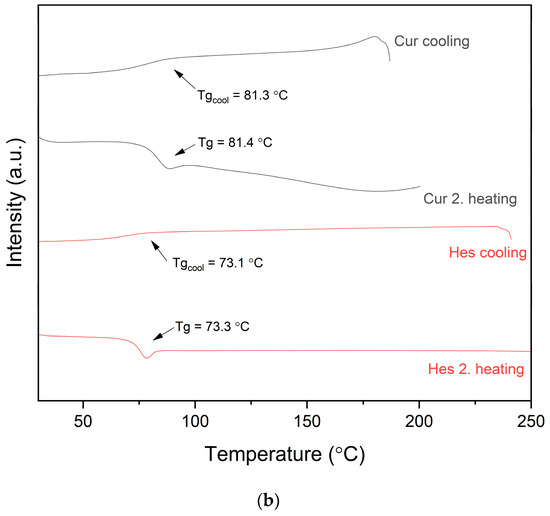 Prior to the development of the initial amorphous solid dispersions, we also estimated the glass-forming abilities of curcumin and hesperetin (Figure 2b) to ensure that the formulation approach using amorphous compounds was reasonable. The procedure was carried out as for sweeteners, applying different cooling rates (20, 10, and 5 °C/min). We found that both active compounds show good glass-forming abilities (Class III glass formers) since crystallization was not observed in the cooling and second heating runs.