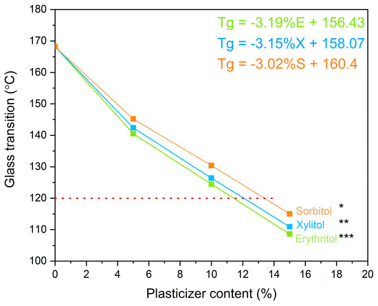 The dependence of the plasticizer content on the Tg (Figure 3) was found to be linear for concentrations ranging from 5 to 15% of the plasticizer content; thus, it was possible to accurately determine the composition of the polymer–plasticizer blend with a specific Tg value from the equation of the straight line. Erythritol being the most effective plasticizer can be explained when the glass transition values of amorphous forms of sweeteners are taken into consideration. We showed that the glassy transitions for erythritol, xylitol, and sorbitol are −42.0 °C, −20.7 °C, and −0.8 °C, respectively. Furthermore, depending on the proportions of the two components in the mixture, the value of the mixture’s glass transition will lie between the values of the glass transitions of the two components when they form a homogeneous mixture [38]. Given that amorphous erythritol has the lowest glass transition value, its plasticizing strength will be most pronounced. Moreover, it is worth noting that the glassy transitions of pure sweeteners are arranged in the order erythritol < xylitol < sorbitol, where erythritol shows the lowest value. We can represent the same order for the plasticizing strength of sweeteners. At equal percentages of sweeteners in the blend with PVP K30, the blend with erythritol demonstrated the lowest Tg value.