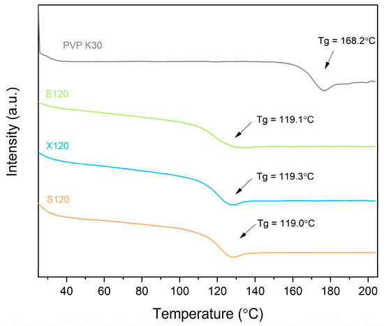 After confirming that sweeteners can act as plasticizers, we proceeded with the preparation of the polymeric matrix suitable for extrusion. The hot-melt extrusion process involves processing a polymeric material above its Tg [39]. Hence, the efficiency of the hot melt extrusion process will mainly depend on the processability of the polymer–plasticizer blend. The design of the final polymer–plasticizer mixture could go two ways. It can be assumed that all blends would have the same plasticizer content, for example, 10%, or that the blends would have the same Tg value, which is possible to determine based on the data presented in Figure 3. It was decided to prepare the blends so that they would have the same Tg of 120 °C. This approach ensured that we could run the process smoothly without modifying it based on the Tg of individual blends. As mentioned earlier, it was decided that extrusion would be carried out at 150 °C; hence, the temperature of Tg = 120 °C should allow an efficient process and provide sufficient physical stability for the resulting amorphous solid dispersion. The DSC thermograms of the designed polymer–plasticizer blend are shown in Figure 4.