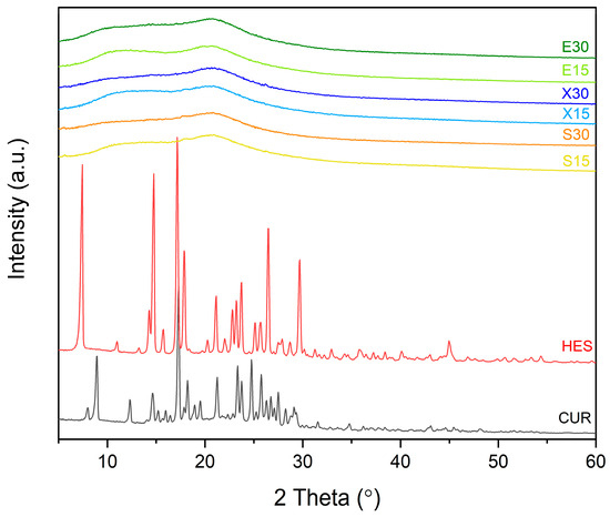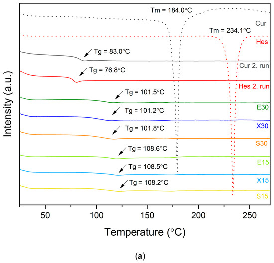 Having completed the studies on polymer–plasticizer mixtures, the next step was to obtain amorphous solid dispersions containing the active compounds via hot-melt extrusion. The quaternary systems (polymer–plasticizer–curcumin–hesperetin) were prepared at two different mass ratios of the active ingredients, 30 and 15% (curcumin:hesperetin ratio 1:1 w/w). The following notation is used throughout the text: the capital letter denotes the sweetener used (E = erythritol, X = xylitol, and S = sorbitol), while the number denotes the total content of active compounds (30 = 30% total content of curcumin and hesperetin in the system; 15 = 15% total content of curcumin and hesperetin in the system).