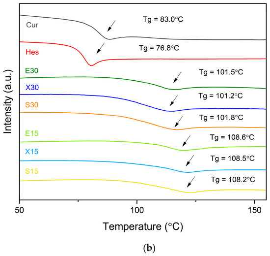 The DSC thermograms (Figure 6) of amorphous solid dispersions showed a single Tg, suggesting that active compounds are molecularly dispersed in the polymeric carriers and confirming the good miscibility of dispersions components [40]. Additionally, the disappearance of endothermic peaks corresponding to melting temperatures of compounds is in agreement with XRPD results and confirms the amorphous nature of the systems, since no sign of crystallinity was detected by this analysis. The active compounds, curcumin and hesperetin, have lower Tg values (Tg = 83.0 °C and Tg = 76.8 °C, respectively) than the binary carrier. Therefore, they will decrease the Tg of the carrier, acting as plasticizers. Therefore, carriers with a higher Tg will exhibit an anti-plasticizing effect on active compounds; hence, they will hamper their molecular mobility, ensuring the stability of the amorphous form of the compounds [41]. Amorphous solid dispersions revealed lower Tg values than carriers, but higher than those of pure amorphous compounds. In addition, dispersions with 30% of active compounds exhibited lower Tg values than dispersions with 15%, which confirms the plasticizing property of compounds. The intermediate value of Tg can be explained by the Gordon–Taylor equation. As it is known, the mixing of two components with different Tg, assuming the miscibility of the components, should lead to a single-phase system with a Tg temperature value within the range of Tg of the individual components, depending on the percentage of components [38]. This principle is applicable in the case of obtained amorphous solid dispersions since Tg values lie between Tgs of dispersions’ constituents.