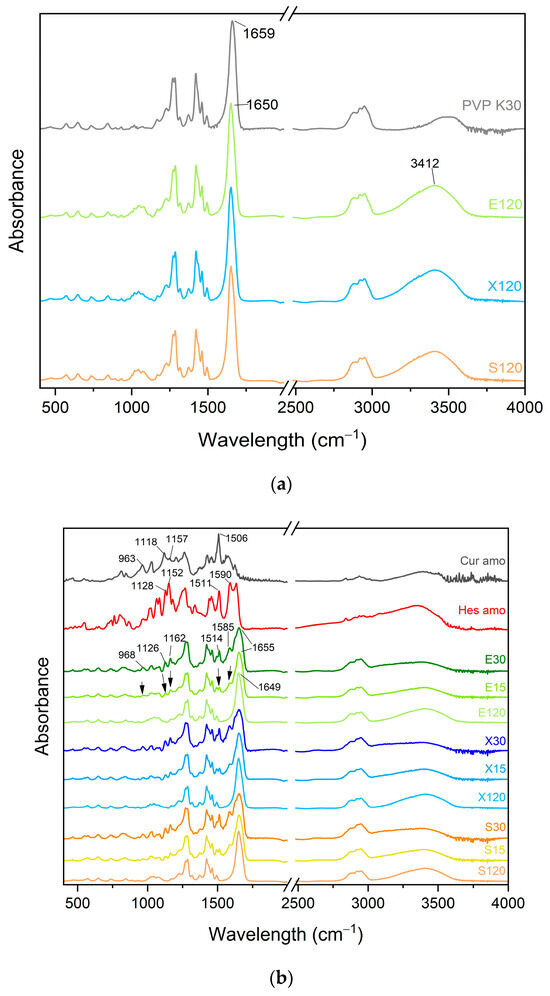 FT-IR spectra of the various systems investigated are presented in Figure 7. The differences between the crystalline and amorphous spectra of curcumin and hesperetin have already been described [42,43].