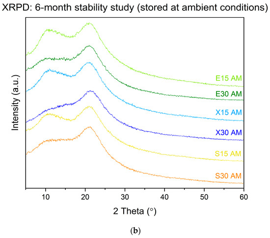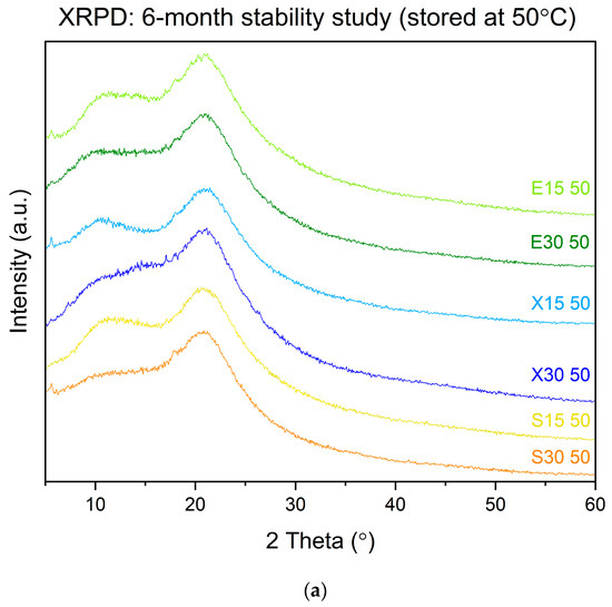When developing amorphous systems, physical stability must be taken into account. From the shelf-life point of view, it is best that formulations are stored at room temperature, and this should apply to formulations comprising amorphous solid dispersions. The extruded systems were initially kept in two different environmental settings: ambient (also referred to as shelf conditions) and at a higher temperature (50 °C) without the humidity factor. The XRPD investigation showed that the systems were stable at both storage conditions after 6 months since XRPD patterns did not display any peaks (Figure 8). Interestingly, dispersions where erythritol was used as a carrier presented an amorphous pattern after 6 months. We previously showed that this sweetener has a high tendency to crystallize (Figure 1); however, crystallization of this compound was not detected. This may be due to molecular interactions contributing to the stabilization of the amorphous form of erythritol in the dispersions, thus preventing recrystallization. The polymer exhibited an anti-plasticizer effect that resulted in a considerable increase in the Tg and therefore in a restriction of global molecular mobility (α-relaxation), mainly responsible for crystallization onset [47]. As a result, crystal formation and growth were prevented even with erythritol. With the Tg values above 100 °C and applying the so-called “Tg-50 rule” [48], it can be concluded that we can expect long-term physical stability for the extruded systems.