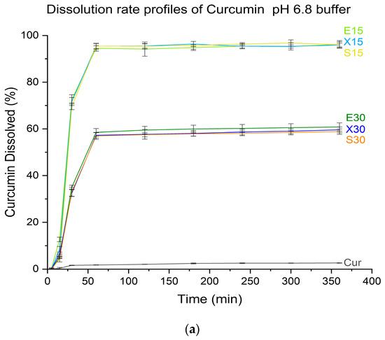 Considering the solubility test (Table 1), the greatest solubility was achieved under pH 6.8 buffer conditions for amorphous solid dispersions containing 15% of active compounds. The improvement was 42,386-fold, 42,343-fold, and 42,286-fold for curcumin and 1184-fold, 1182-fold, and 1181-fold for hesperetin for the E15, X15, and S15 systems, respectively. The very significant improvement in apparent solubility values could be due to the amorphous nature of the active compounds and the presence of sugar alcohols acting as hydrotropic agents. It is known that polyols can increase the solubility of many poorly soluble compounds [49]. The lower values measured in HCl solutions are consistent with previous observations made by Paulazzi et al. for curcumin [50] and Lucas-Abellan et al. for hesperetin [51].