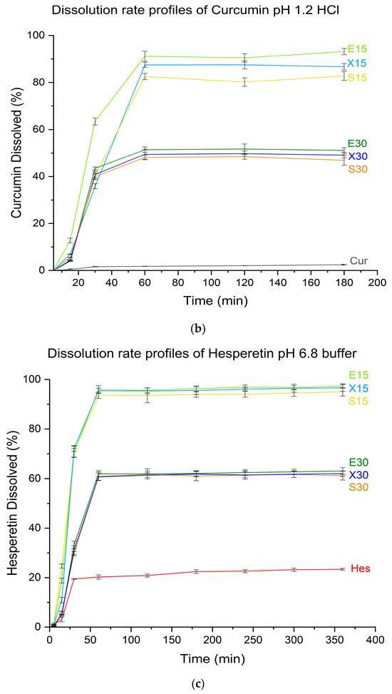 Considering dissolution studies, amorphous solid dispersions resulted in a supersaturated state (Figure 9), which means higher amounts of the compounds dissolved than expected compared to the crystalline solubility (Table 1). In the case of curcumin, there was a 38-fold improvement in solubility for systems E15 and a 23-fold improvement for E30, while for hesperetin, it was 4- and 3-fold, respectively, compared to pure compounds. The dissolution rate profiles for E15, X15, and S15 systems are similar in pH 6.8 buffer. It can be concluded that in this case, the amount of polymer had a lesser impact on the performance of the systems, and it was sufficient to maintain the supersaturated state. There is less polymer in S15 systems compared to E15 and X15 due to the weaker plasticizing effect of sorbitol. However, despite this, the release profile for this system was not worse in comparison to the others. It can be seen that the amount of polymer affects the resulting dissolution rate profile and apparent solubility. Systems with more polymers—a lower drug load—performed better. They showed a better improvement in solubility and dissolution rate. When tested in pH 6.8 buffer, systems with 15% of active compounds presented similarly; they allowed almost complete dissolution of active compounds. On the other hand, for pH 1.2 HCl conditions, differences in behavior can be seen. The best improvement in apparent solubility was observed for E15 systems, which enabled the dissolution of a similar amount of active compounds as in pH 6.8 buffer. X15 and S15 systems performed worse in pH 1.2 HCl, reaching 84.5% and 78.2% of dissolved curcumin and 82.2% and 78.4% of dissolved hesperetin, respectively, while in pH 6.8 buffer, these systems allowed the dissolution of 95.4% of curcumin and 95.6% of hesperetin for X15 and 95.3% of curcumin and 95.4% of hesperetin for S15. It is important to note that we observed incomplete dissolution of the 30% systems with the particles of the system floating in the dissolution medium.