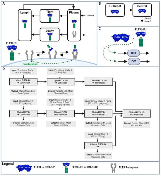 Preclinical and clinical data were obtained from the published literature or the studies conducted by Genentech. A summary of the data used for model calibration or validation, including study titles, dose levels/regimens, measurements, and the source of the data is provided in Table S1. The list of studies includes two internal preclinical studies in cynomolgus monkeys using FLT3L-Fc (Genentech Studies) and three clinical studies from other FLT3L-based therapies [22,23,40]. The PK of FLT3L-Fc in preclinical studies 1 and 2 (Genentech Studies) were measured using ELISA methods (anti-FLT3L capture and anti-human Fc detection) with a lower limit of quantification (LLOQ) of 31.3 ng/mL for preclinical study 1 and 7.8 ng/mL for preclinical study 2. Detection of anti-drug antibodies (ADAs) to FLT3L-Fc for preclinical study 1 utilized a direct ELISA where FLT3L-Fc was directly coated on the ELISA plate, and cynomolgus monkey IgG directed against FLT3L-Fc was detected with an anti-cynomolgus monkey IgG antibody. Preclinical study 2 utilized a bridging ELISA with biotin- and digoxigenin-conjugated RO7497987 to capture and detect ADAs directed against RO7497987. The PK/PD of CDX-301 and recombinant human FLT3L in clinical studies 1 and 2, and the PK of GS-3583 in clinical study 3 were digitized using “GetData Graph Digitizer” version 2.26 (http://getdata-graph-digitizer.com, accessed on 26 April 2024). Since other recombinant human FLT3Ls are expected to behave similarly to CDX-301, we will henceforth refer to them collectively as CDX-301 for the purpose of our modeling. Figure 1 (created with Biorender) provides a summary of the workflow and the use of data for model calibration and validation.