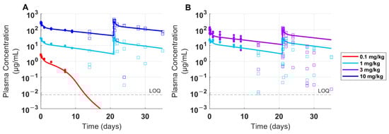Time-course data and model fits for FLT3L-Fc PK in cynomolgus monkeys. Individual cynomolgus monkeys (n = 3) were treated with a single dose of 0.1 mg/kg, or two doses of 1 mg/kg, or 10 mg/kg with a three-week interval between doses in preclinical study 1. Individual cynomolgus monkeys (n = 6) were treated with two doses of 1 mg/kg, or 3 mg/kg with a three-week interval between doses in preclinical study 2. (A) Drug concentrations of FLT3L-Fc from preclinical study 1 was used to calibrate the cynomolgus monkey PK parameters in the model. (B) PK from preclinical study 2 served as a validation dataset for the model predictions. Open squares and solid dots represent individual PK samples that were ADA-positive and ADA-negative, respectively. LOQ: limit of quantification.