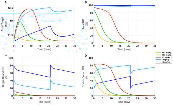 Projected target expression and receptor occupancy in cynomolgus monkeys following FLT3L-Fc treatment. (A) The total estimated target expression in cynomolgus monkeys following a single FLT3L-Fc dose (0.01, 0.03, and 0.1 mg/kg) or two FLT3L-Fc doses (1 and 10 mg/kg) administered three weeks apart is shown. (B) The percent of total FLT3 receptor occupancy (RO), (C) percentage of FLT3 receptors occupied in a single-bound complex, and (D) percentage of FLT3 receptors occupied in a double-bound complex are also shown.