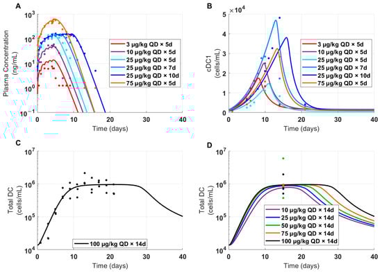 A single-compartment PK model with nonlinear clearance was used to capture the observed PK of CDX-301 in healthy volunteers treated with daily SC injections at 3, 10, 25, and 75 μg/kg/day in clinical study 1 [23] (Figure 4A). CDX-301 PK exhibited a dose-linear increase in the maximum observed concentration (Cmax) and a dose-dependent increase in the area under the curve (AUC) [23]. The PD model parameters were fitted to the cDC1 time-course data from Anandasabapathy et al. (clinical study 1) [23] and total DC counts (equivalent to sum of cDC1s and cDC2s in the model) from Maraskovsky et al. (clinical study 2, part 1) [22]. A subset of total DC data from Maraskovsky et al. [22] (clinical study 2, part 2) was set aside for validation. The model simulations successfully reproduced clinical CDX-301 PK and captured the dynamics and dose-dependent saturable expansion of cDC1 and total DC counts reasonably well across both studies (Figure 4). Given that FLT3L-based therapies lead to a significant fold expansion of DCs, the group-specific baseline levels for cDC1 were incorporated into the model to improve the goodness of fit. In clinical study 1, CDX-301 daily injections from 3 to 75 μg/kg produced a dose-dependent expansion of cDC1s (Figure 4B). The model captured the dynamics of expansion for all groups. Although the model slightly overpredicted the peak of cDC1 expansion in the 25 μg/kg × 5 cohort and underpredicted the peak in the 25 μg/kg × 10 cohort, it successfully captured peak expansion for the upper (75 μg/kg × 5) and lower dose regimens (3 and 10 μg/kg × 5) (Figure 4B). Conversely, in clinical study 2, total DC expansion was comparable between the lowest dose (10 μg/kg/day) and the highest dose (100 μg/kg/day) following 14 days of daily treatments. Further, the total DC profile showed signs of saturation at around 10 days post initiation of FLT3L treatment (Figure 2D and Figure 4C). The model captured the rate of total DC expansion and the magnitude and timing of saturation following treatment with 100 μg/kg/day for 14 days (Figure 4C) and successfully predicted the saturation from 10–100 μg/kg (Figure 4D). These calibration and validation steps established confidence in the predictive capabilities for clinical PD projection.