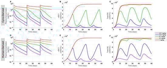 Cynomolgus monkey PK of FLT3L-Fc was used to project human PK by translating cyno-derived physiologically based PK parameters including lymph flow rate, interstitial fluid volume, and volume of distribution to human parameters and allometrically scaling CL, as previously published [42,43]. Two PK scenarios were simulated using different target-related parameters (i.e., FLT3 target capacity and proliferation-related parameters): (1) in the cyno-derived scenario, parameters were fixed based on the estimated parameters from cynomolgus monkey PK data or (2) in the human-derived scenario, parameters were adjusted to better match the PK of limited PK data of GS-3583 in healthy volunteers at two dose levels (Figure 5). The model simulated plasma exposures following multiple doses at levels ranging from 0.01–1 mg/kg for both scenarios. These PK profiles were then used to project the dynamics and level of cDC1 and total DC expansion using the PK/PD relationship established from the CDX-301 clinical data. Nonlinear PK was apparent in both scenarios at ≤0.1 mg/kg, and the loss of exposure due to TMDD at low dose levels was more pronounced in the cyno-derived scenario than the human-derived scenario because of the greater target concentration in the cyno-derived scenario (Figure 6A,D). As a result, the cyno-derived scenario required about a three-fold greater dose than the human-derived scenario to maximize the DC expansion effect (0.3 mg/kg vs. 0.1 mg/kg), causing cDC1 and total DC to plateau at approximately 70,000 and 1,000,000 cells/mL, respectively (Figure 6). Given that the human-derived scenario required a lower dose to induce a similar PD effect than the cyno-derived scenario, the human-derived scenario was chosen for FIH dose selection as the more conservative approach to achieve mPAD in healthy volunteers.