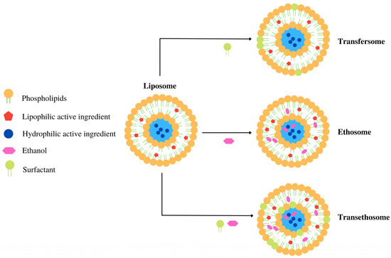 Moreover, various approaches are employed to enhance the fluidity of these systems, such as the addition of ethanol or surfactants as membrane modifiers. This results in the formation of new vesicles known as ethosomes, transfersomes, and transethosomes, which will be discussed further. Ethanol and surfactants interact with the lipid components of the stratum corneum (SC), disrupting the tightly packed lipids, altering the structure of keratinized or lipophilic domains, and reducing the transition temperature of lipids [40]. Additionally, these membrane modifiers penetrate the hydrocarbon chains and alter the net charge of the vesicles, leading to a reduction in their size. Consequently, researchers have utilized these compounds as permeation enhancers [40,41].