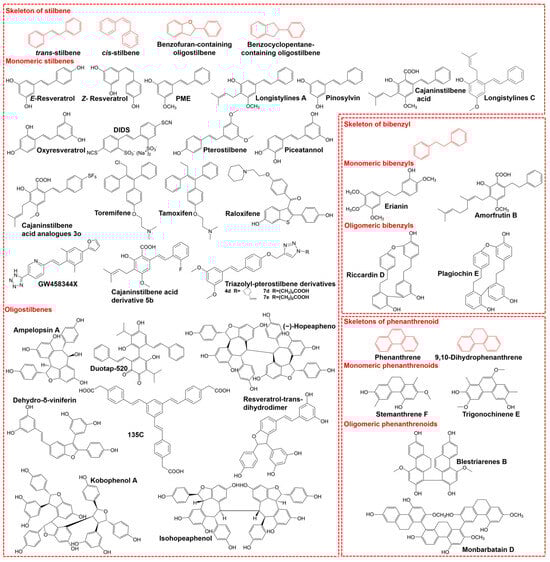 Skeleton characteristics and representatives of three kinds of stilbenoids. Stilbenoids can be divided into three categories according to their chemical structure, including stilbene, bibenzyl and phenanthrenoid.