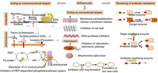 Stilbenoids exert antimicrobial activities via various modes (Figure 2). The antimicrobial mechanisms mainly include (I) acting on conventional targets, (II) acting on nonconventional targets and (III) reversing antibiotic resistance. Firstly, stilbenoids can inhibit conventional targets, such as the cell membrane, cell wall, DNA, the calmodulin–calcineurin pathway, mitochondria, cell division and the phosphoenolpyruvate (PEP)-dependent phosphotransferase system. Secondly, stilbenoids can function as antibiofilm or antivirulence agents. Stilbenoids inhibit biofilm formation and assist in the eradication of preformed biofilms. Moreover, stilbenoids can reverse drug resistance by inhibiting alternative targets, target-modifying enzymes or antibiotic-modifying enzymes.