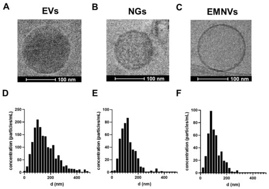 Characterization of NPs. Cryo-TEM images of (A) EVs, (B) NGs and (C) EMNVs. Nanoparticle tracking analysis of NPs: (D) EVs, (E) NGs and (F) EMNVs.