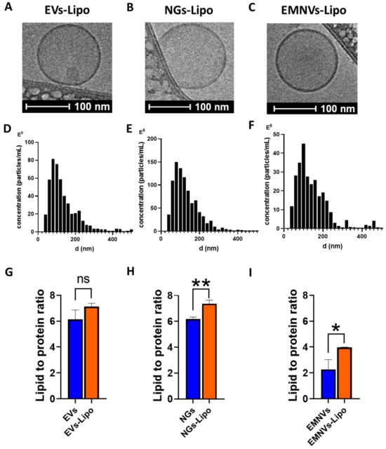 Characterization of hybrid NPs. Cryo-TEM images of (A) EVs-Lipo, (B) NGs-Lipo and (C) EMNVs-Lipo. Nanoparticle tracking analysis of NPs: (D) EVs-Lipo, (E) NGs-Lipo and (F) EMNVs-Lipo. Lipid-to-protein ratio measured for (G) EVs and EVs-Lipo, (H) NGs and NGs-Lipo and (I) EMNVs and EMNVs-Lipo. * p < 0.05, ** p < 0.01. ns—non significant. Three replicates were collected for each sample to quantify protein and lipid concentrations.